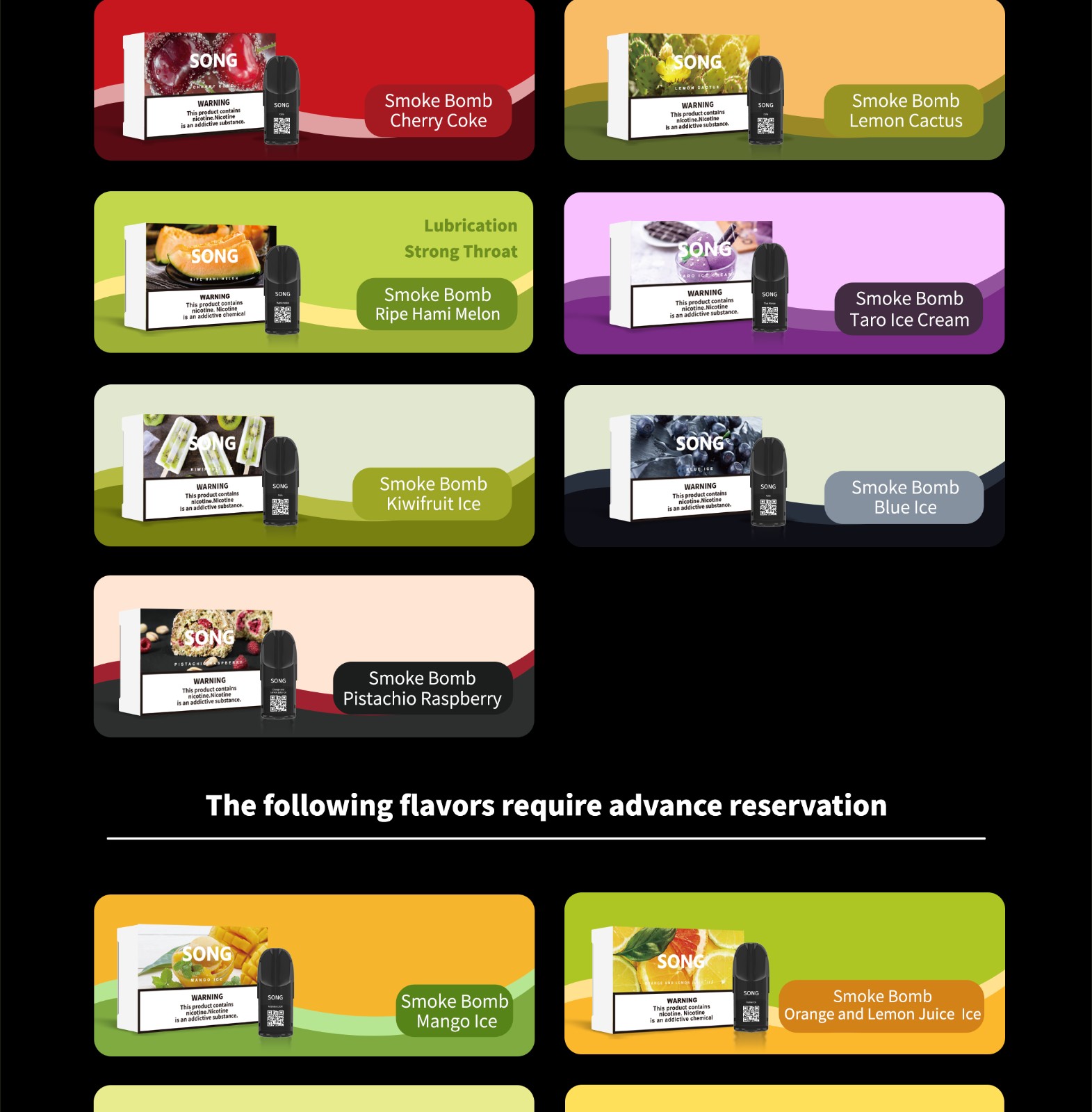 عنب الثعلب الأسود ، فحم الكوك ، taimang ، ليتشي ، ناضجة هامي البطيخ ، ونغجينغ ، ربيع الجليد ، مونج الفول عصير التفاح الأخضر ، شاي الليمون ، هامي البطيخ ، الجريب فروت الجليد ، الآيس كريم القلقاس ، الجوافة الجليد ، لاتيه . 34 نكهات اختيارية