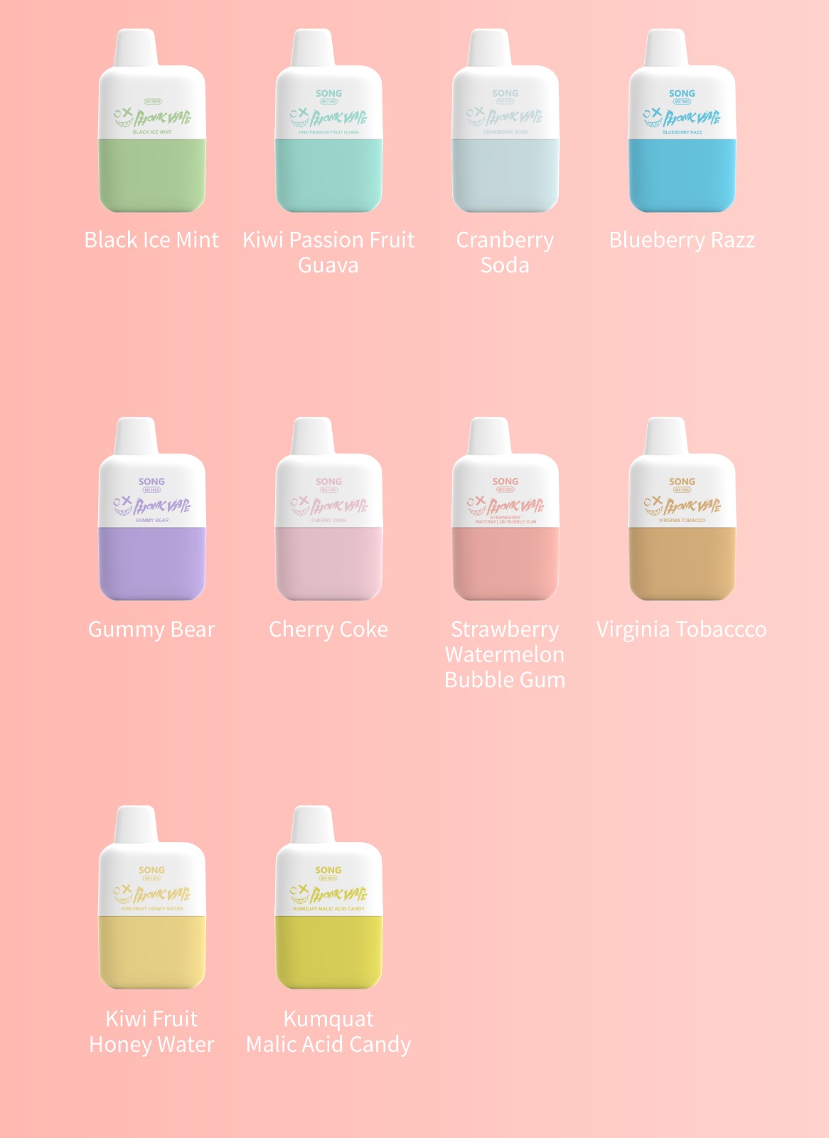 Black ice mint/Kiwi passion fruit guava/Cranberry soda/Blueberry razz/Gummy bear/Cherry coke/Strawberry watermelon bubble gum/Virginia tobaccco/Kiwi fruit honey water/Kumquat malic acid candy